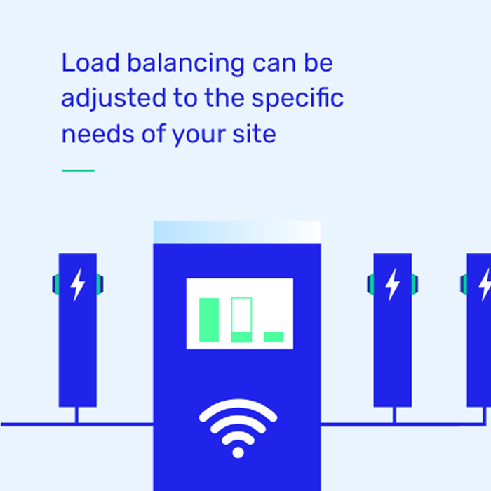 Our solution entails an integrated Charge & Energy Management (C&EM) platform which optimizes the use of energy and maximizes the use of current or planned electronic infrastructure. This platform supports smart load balancing for the complete configuration including all connected charging points and offers the following advantages: