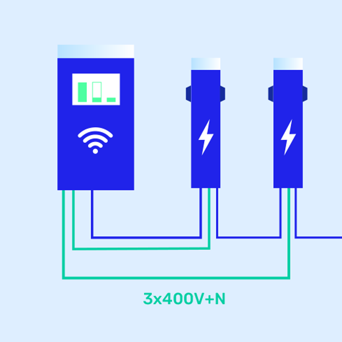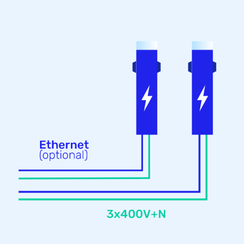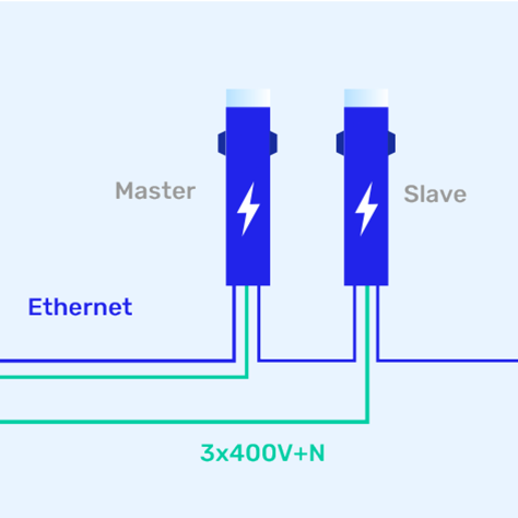 Voor parkeerplaatsen waar meerdere laadpunten worden ingezet, is het aan te raden om onderling verbonden laadpunten in een master-slave configuratie te plaatsen. Tussen elk van de oplaadpunten is een ethernetverbinding nodig om onderlinge communicatie mogelijk te maken.